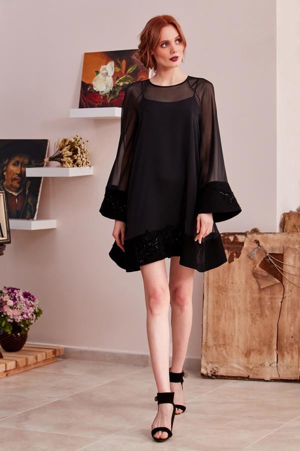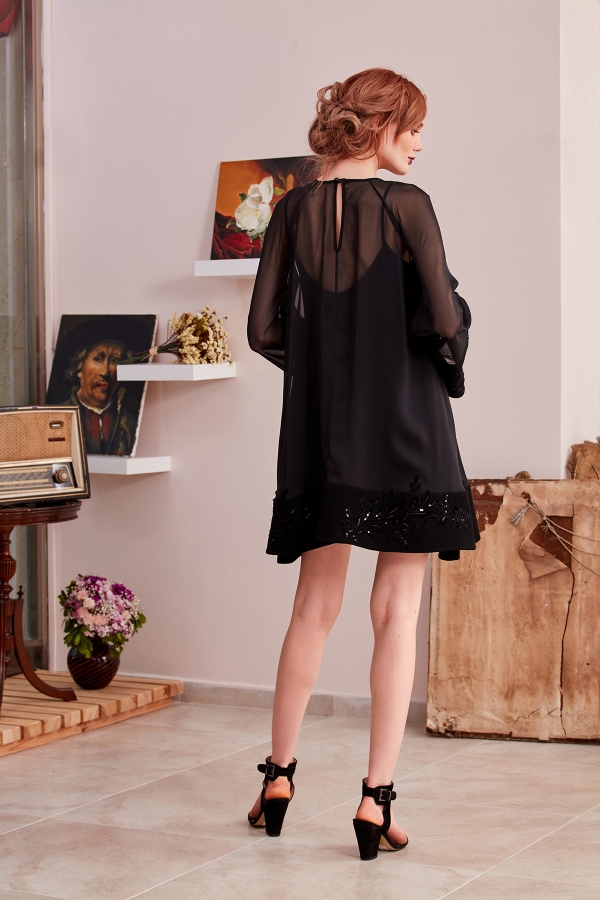 Custom design black volant dress with handmade bead details in arms and the skirt.